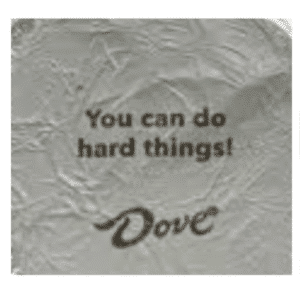 At the time, I was having a snack of Dove dark chocolates and reading the inside wrapper as I opened each one, looking for the words of encouragement. I opened two in a row that said, “You can do hard things!” Then I opened a third with the same message. I have eaten many of these chocolates, and this is not normal—rarely do I get two in a row with the same message. Then I opened chocolates four, five, and six… all with the same message. I would have opened more, but that was all I had in my snack bowl at the time. Yes, I ate a lot of chocolate that night!